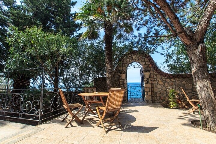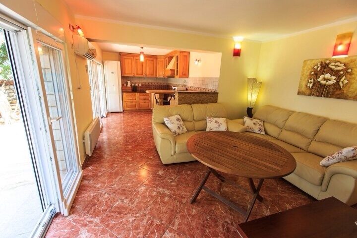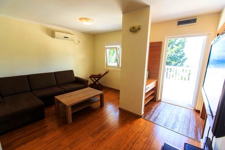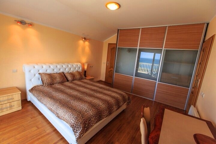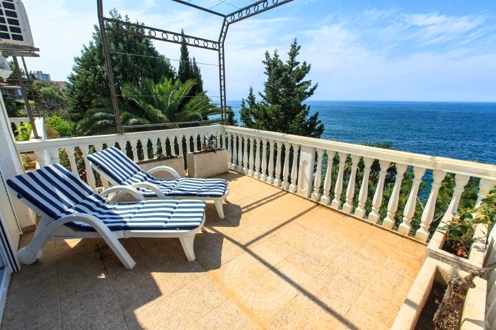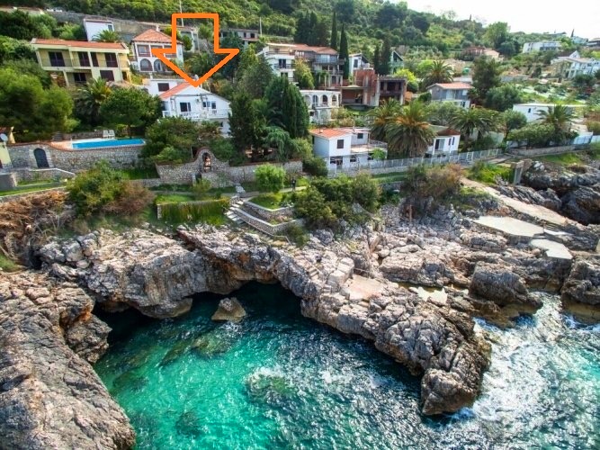 Dobre Vode, kuća povrsine 230m2, na placu površine 355m2. Kuca se nalazi na prvoj liniji od mora. Strukturu kuće čine: u prizemlju velika kuhinja, trpezarija, TV i kamin, garaza površine 30m2, komotna za 2 automobila. Na prvom spratu nalaze se tri spavace sobe i tri kupatila. Sve spavace sobe imaju balkone sa pogledom na more, od kojih je jedna spavaca soba površine 30m2. Na drugom spratu se nalaze dvije spavaće sobe, svaka sa kupatilima i terasama sa pogledom na more. Kuća je opremljena klima uredajima sa split sistemom i brzim pristupom internetu. Glavni ulaz kuce nalazi se na prvom spratu.